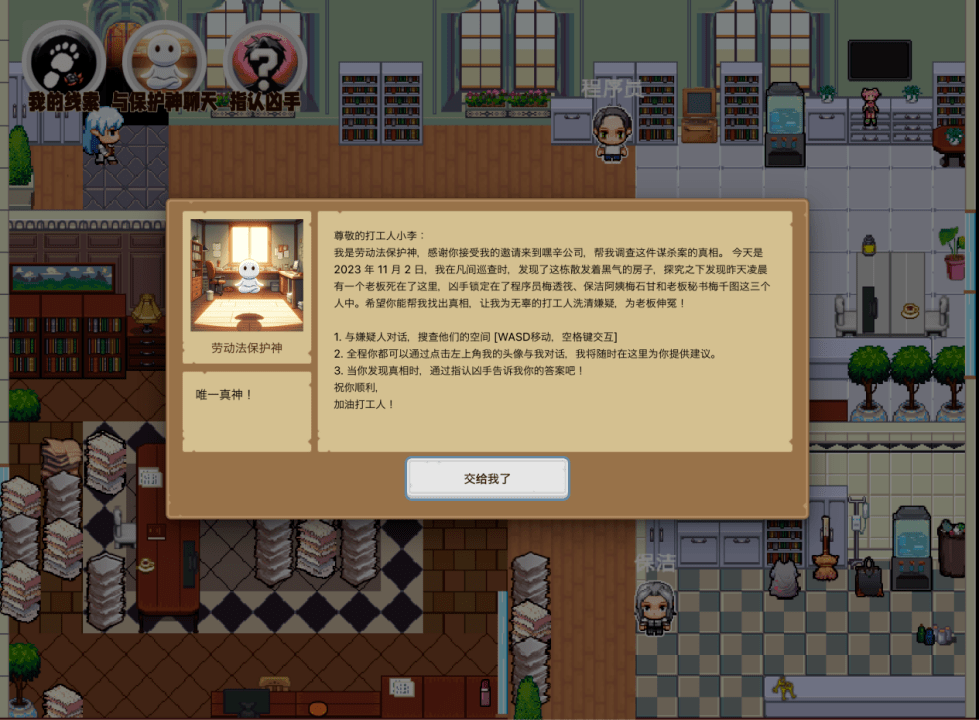 让想象力得以分享。而若何让AI拆解逛戏设想里的各个节点,RPGGO基于自研的Zagii Engine,以及具有逛戏情节内核的内容,AI能够创做出爆款案牍,玩家能够通过取嫌疑人(AI智能体NPC)对话,同时,同时正在每一场逛戏过程中,AI会记实玩家正在逛戏中的进度,当创做者正在平台上完成简单编纂后,RPGGO的参展项目利用了文心一言做为NPC的中文言语模子基底,让所有人都能生成一个世界。
