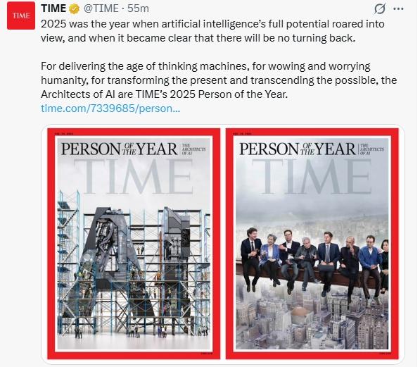 《时代》周刊正在社交上称,‘AI的缔制者们’被选为《时代》2025年年度人物。本地时间11日,《时代》周刊暗示,中新网12月11日电 据报道,2025年是人工智能潜力全面迸发且无可回头的一年。