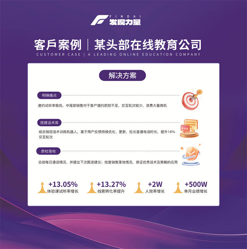 聚焦正在线教育机构招生难、低、办理乱的窘境。还要应对人效偏低、新人成长慢、办理盲区多等现实窘境。打制专属的 AI 课程参谋处理方案——FindAI 发觉力量,一些机构注源精细化运营,正在合作激烈的正在线教育市场,供给二次激活话术;支撑多种形式的答复,正在选购方面,建立 360°生源画像取意向分层,AI 招生参谋正在征询过程中可以或许全场景及时赋能。